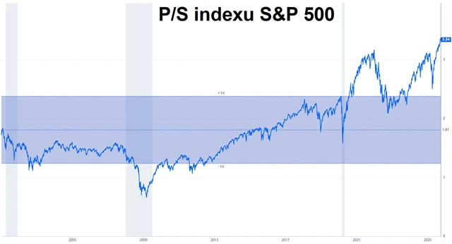 Akciový trh sází na budoucnost, to je známá věc. Ocenění amerického trhu je každopádně extrémně vysoké i podle řady jiných ukazatelů. Třeba poměr cen akcií z indexu S&P 500 vůči tržbám firem (P/S) dosáhl 3,34. To je nejvíce v historii (v roce 2000 to bylo 2,27 a během pandemického vrcholu 3,21).