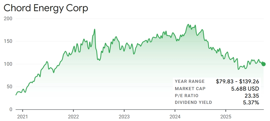 Nezávislá těžební společnost Chord Energy vyplatila ve druhém čtvrtletí základní dividendu 1,30 USD na akcii. Za posledních 12 měsíců pak akcionáři obdrželi celkem 5,34 USD, což odpovídá dividendovému výnosu 5,37 %.