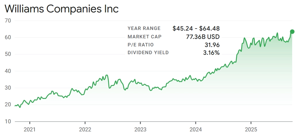 Společnost Williams Companies, která provozuje rozsáhlou síť energetické infrastruktury v USA, vyplácí čtvrtletní dividendu 0,50 USD na akcii, což je meziročně o 5,3 % více. V přepočtu na roční bázi to odpovídá 2 USD na akcii a dividendovému výnosu 3,16 %.