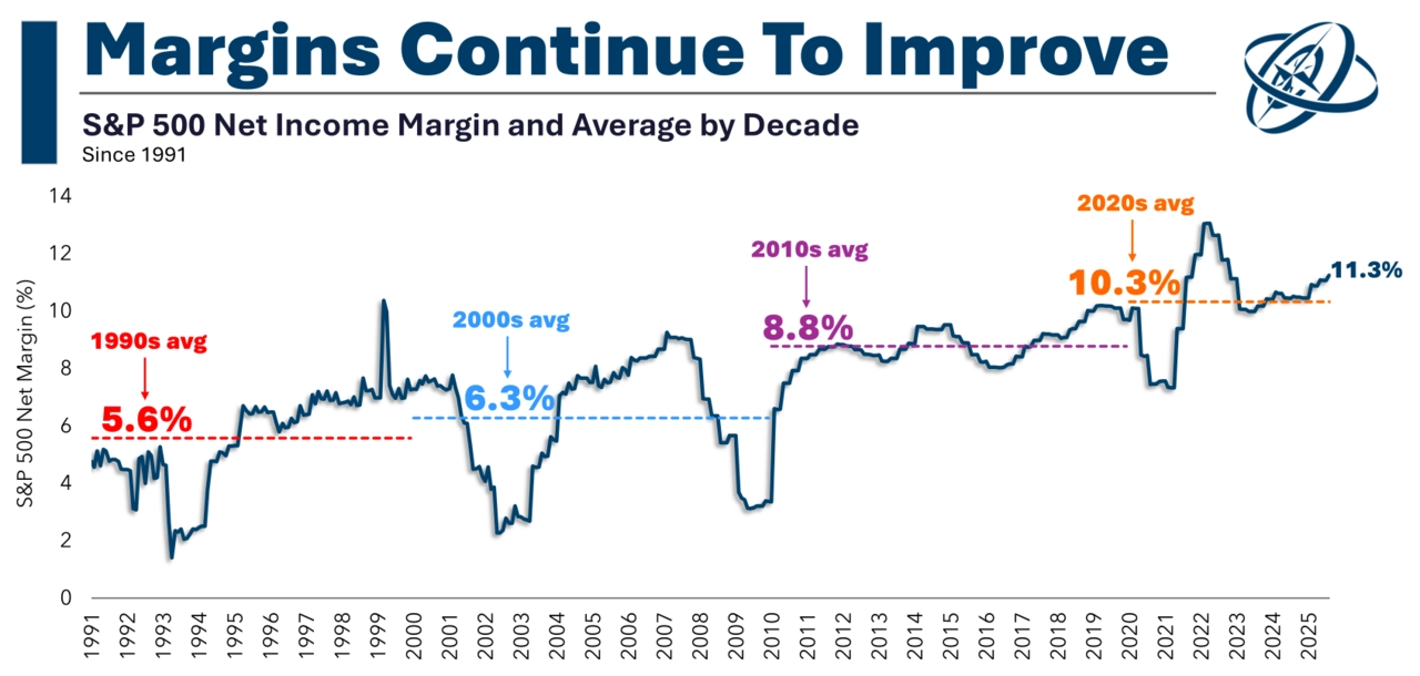 Když se přitom z horizontu dnů, měsíců a kvartálů posuneme na úroveň let a celých desetiletí, nemůžeme si nevšimnout, že po roce 2010 zisky firem z amerického akciového indexu S&P 500 rostou vysoce nadprůměrným tempem. V desátých letech v průměru skoro o 11 % za rok, od roku 2020 pak bezmála 10% tempem. Obě tyto míry zlepšování sledovaných firemních fundamentů jsou vysoko nad dlouhodobým průměrem okolo 5 %.