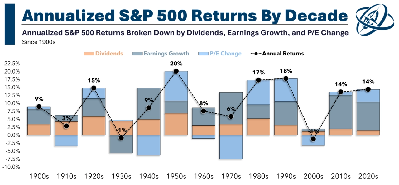 Silný růst zisků sám o sobě nezaručuje nadprůměrné zhodnocování akcií. Historie pamatuje období, kdy zisky rostly rychle, ale inflace nebo geopolitické okolnosti investorům vzaly vítr z plachet, například ve 40. a 70. letech 20. století. A naopak nastaly dekády (20., 50. nebo 80. léta minulého století), kdy se akcie zhodnocovaly nadprůměrně, i když zisky rostly relativně pomalu.