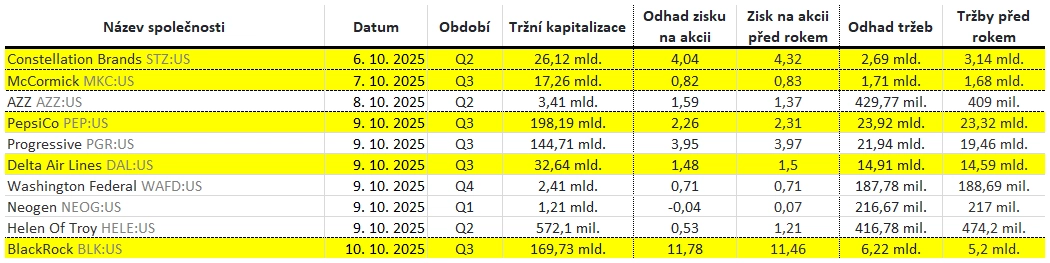 Které firmy představí výsledky hospodaření za uplynulý kvartál v týdnu od 6. října 2025 a jaké zisky v rámci indexů S&P 500 a STOXX Europe 600 očekávají analytici oslovení agenturou LSEG?