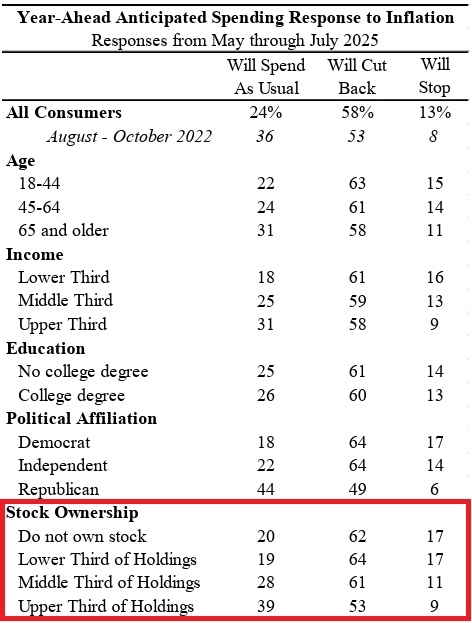 Zatímco z třetiny domácností s největším akciovým majetkem jich v příštích měsících útraty neplánuje omezovat 39 %, z třetiny domácností s nejmenším akciovým majetkem jich vyjadřuje stejné vyhlídky jen 20 %.