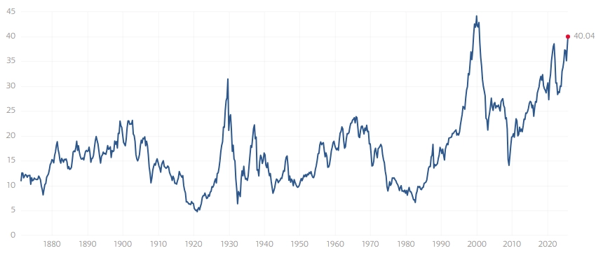 Obavy ohledně vyhlídek amerického akciového trhu vyvolávají také vysoké valuace. Shillerovo P/E indexu S&P 500 je kolem 40, je tedy nejvyšší od léta 2000 a dosahuje více než dvojnásobku průměru za více než 150 let.