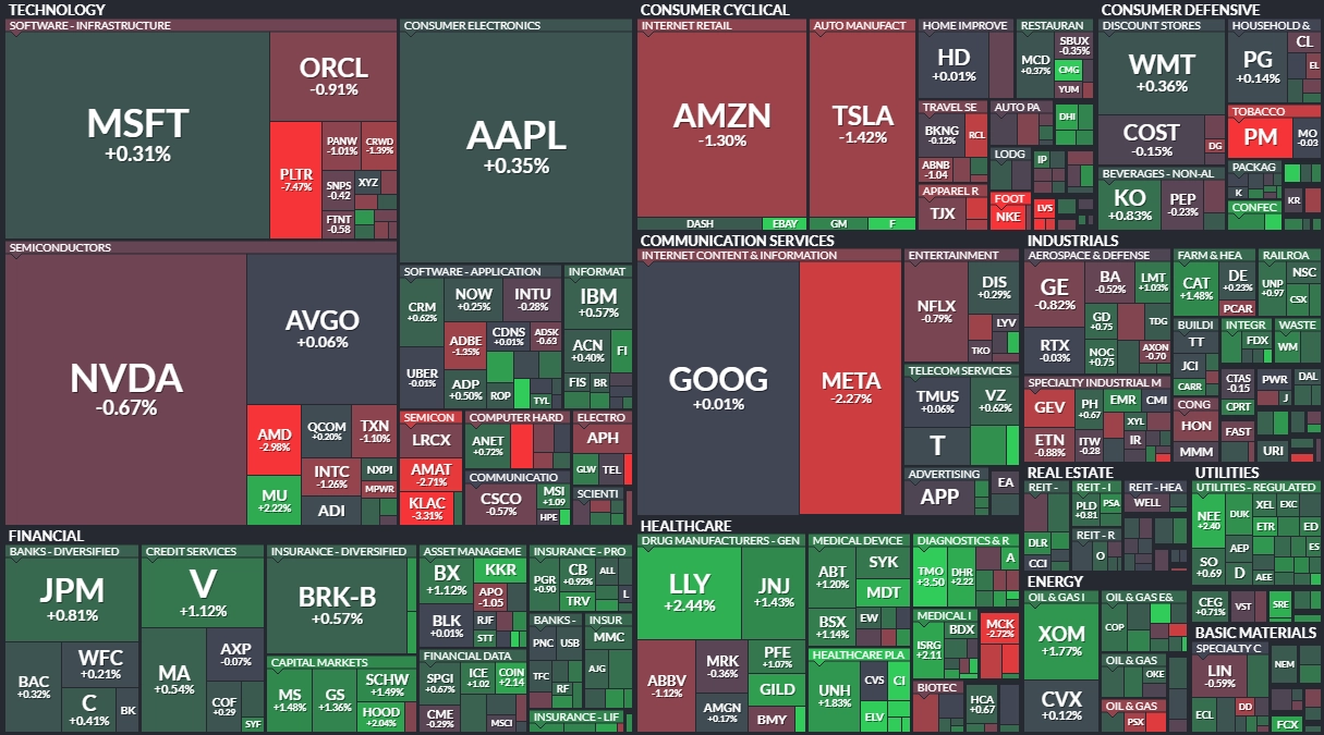 Dařilo se mimo jiné akciím ropné firmy ExxonMobil (+1,77 %), výrobce čipů Micron Technology (+2,22 %) nebo farmaceutických podniků Eli Lilly & Co (+2,44 %) a Pfizer (+1,07 %). Oslabily naopak cenné papíry Tesly (-1,42 %), Amazonu (-1,30 %), Mety (-2,27 %) nebo Palantiru (-7,47 %).