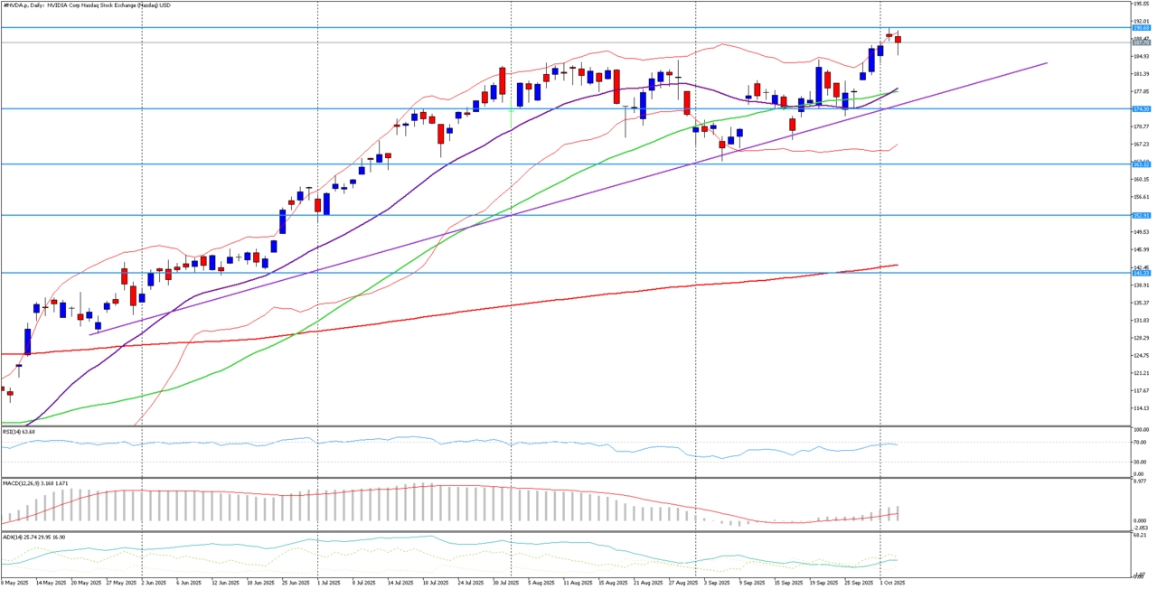 Cena akcií společnosti NVIDIA se po zhruba dvouměsíční konsolidaci mezi 163 a 183 USD minulý týden posunula na nové intradenní maximum lehce nad 190 USD a zavírací maximum bezmála 189 USD. Co o jejím dalším vývoji napovídá technická analýza?