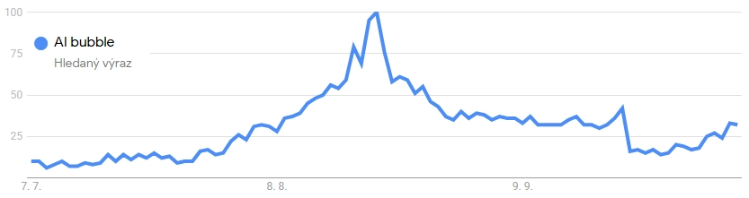 Podle údajů z nástroje Google Trends dosáhlo vyhledávání termínu AI bubble vrcholu ve Spojených státech 20. a celosvětově 21. srpna. Tedy krátce poté, co Massachusettský technologický institut zveřejnil zprávu, podle které 95 % pilotních projektů využívajících generativní umělou inteligenci firmám nepřináší žádné benefity. Zhruba ve stejnou dobu navíc Meta Platforms pozastavila nábor lidí do svého AI týmu, šéf OpenAI Sam Altman připustil, že nadšení investorů ohledně umělé inteligence je přehnané, a uživatelé spíše vlažně přijali nově vydaný jazykový model ChatGPT-5.