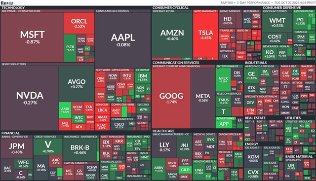 Index Dow klesl o 0,20 % na 46 602,98 bodu, širší index odepsal 0,38 % na 6 714,59 bodu a technologický index Nasdaq Composite se snížil o 0,67 % na 22 788,36 bodu. Index volatility VIX vzrostl o 5,31 % na 17,24 bodu a výnos 10letých vládních dluhopisů USA klesl o čtyři bazické body na 4,129 %. Ceny ropy se zvedly asi o půl procenta, zlato po vzestupu k hladině 4 000 USD za trojskou unci nakonec zdražilo o o zhruba půl procenta a bitcoin zlevnil asi o dvě procenta na 122 170 USD.