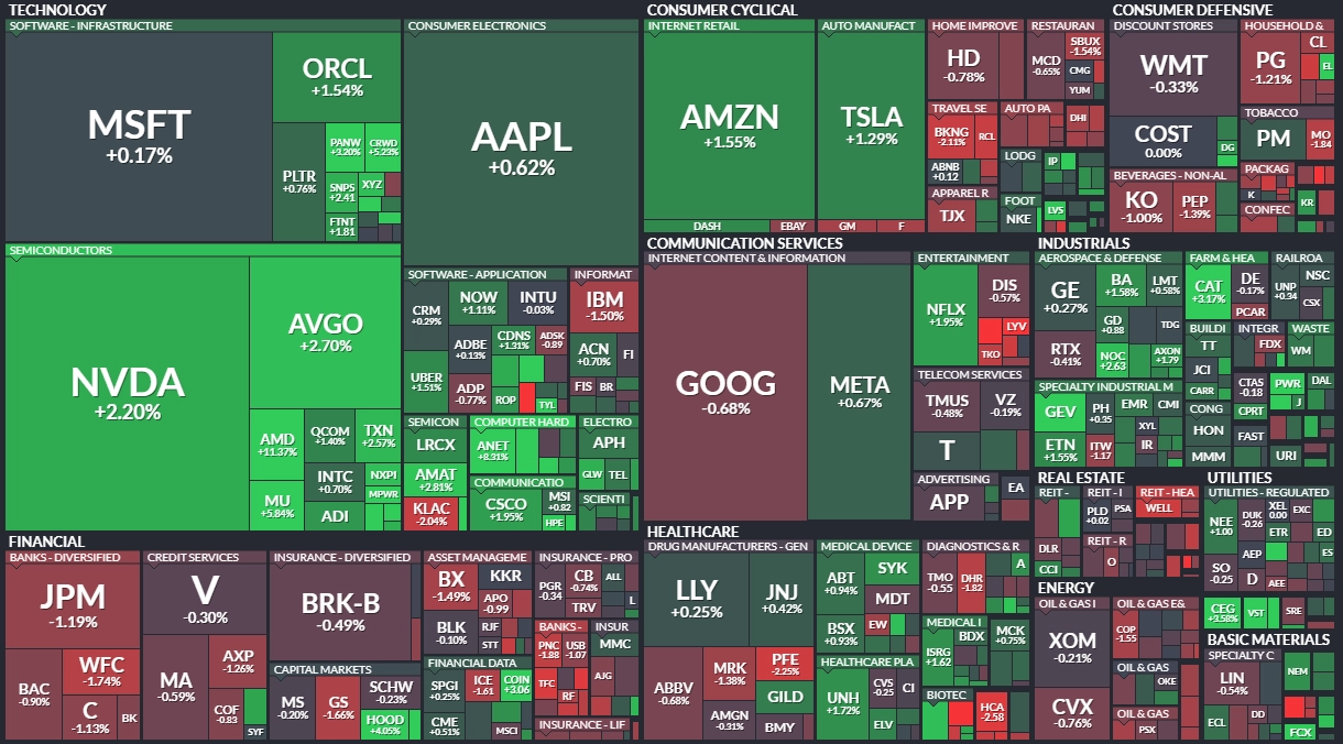Index Dow uzavřel na červené nule, klesl o 1,20 bodu na 46 601,78 bodu, širší S&P 500 se zvýšil o 0,58 % na 6 753,72 bodu a index technologického trhu Nasdaq Composite si připsal 1,12 % na 23 043,38 bodu. Index volatility VIX spadl o 5,45 % na 16,30 bodu a výnos 10letých vládních dluhopisů USA se zvýšil o půl bazického bodu na 4,131 %. Absolutní rekord S&P 500 posunul na 6 755,64 bodu a Nasdaq Composite na 23 045,14 bodu.