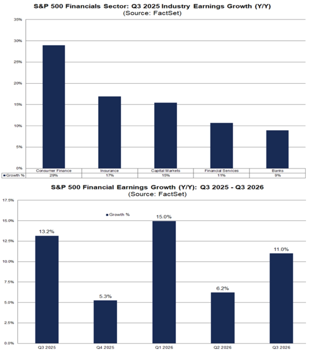 V týdnu bude hned 65 % oznamovaných čísel za třetí kvartál v rámci indexu S&P 500 připadat na finanční sektor. Vedle velkých bank do něj patří také American Express nebo Travelers Companies. Odvětví by mělo vykázat čtvrtý nejvyšší meziroční růst (+13,2 %). Všechny podsektory by měly oproti loňskému třetímu čtvrtletí posílit, z toho hned čtyři dvojcifernou procentuální mírou (spotřebitelské finance, pojišťovnictví, kapitálové trhy, finanční služby).