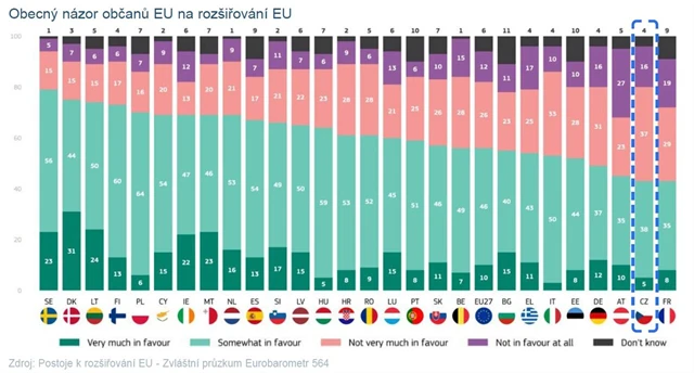 Celkem 56 % Evropanů podporuje rozšíření Evropské unie, vyplynulo z nového průzkumu Eurobarometr. Podpora je obzvláště vysoká mezi mladými lidmi, když přibližně dvě třetiny respondentů ve věku 15 až 39 let se domnívají, že potenciální kandidáti by měli vstoupit do EU, jakmile splní nezbytné podmínky. V Česku rozšiřování podpořilo jen 43 % oslovených.