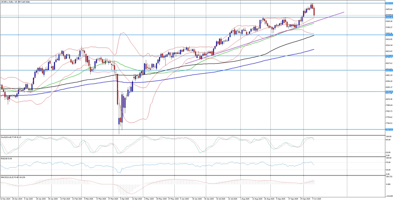 Akciový index FTSE 100 po dosažení intradenního rekordního maxima 9 577 bodů ve středu vrátil níže a konsoliduje. Aktuálně se drží těsně nad 9 400, i přes krátkodobé zpomalení je ale jeho graf v silně růstovém nastavení, které trvá prakticky od dubna.