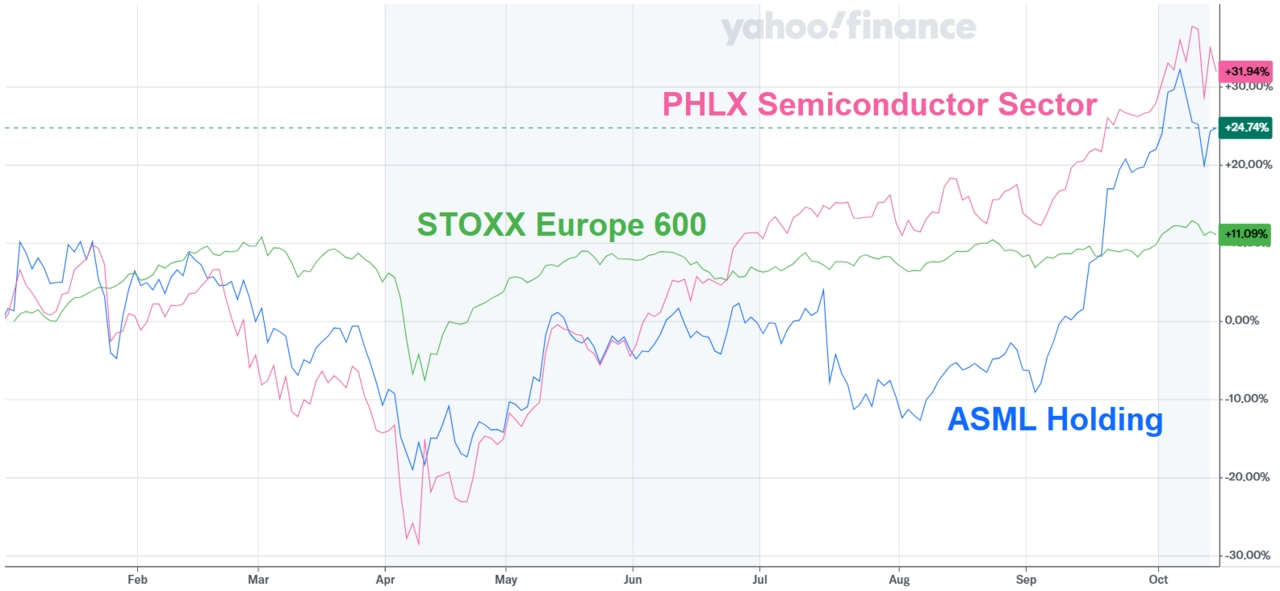 ASML, nejhodnotnější evropská společnost s akciemi na burze, je světově největším konstruktérem litografických strojů pro výrobu čipů a jako jediná ovládá technologii extrémní ultrafialové litografie (EUV). Ta umožňuje tisk velice jemných vzorů na křemíkové plátky s vyšším rozlišením, což je klíčové pro výrobu nejmodernějších výkonných čipů.