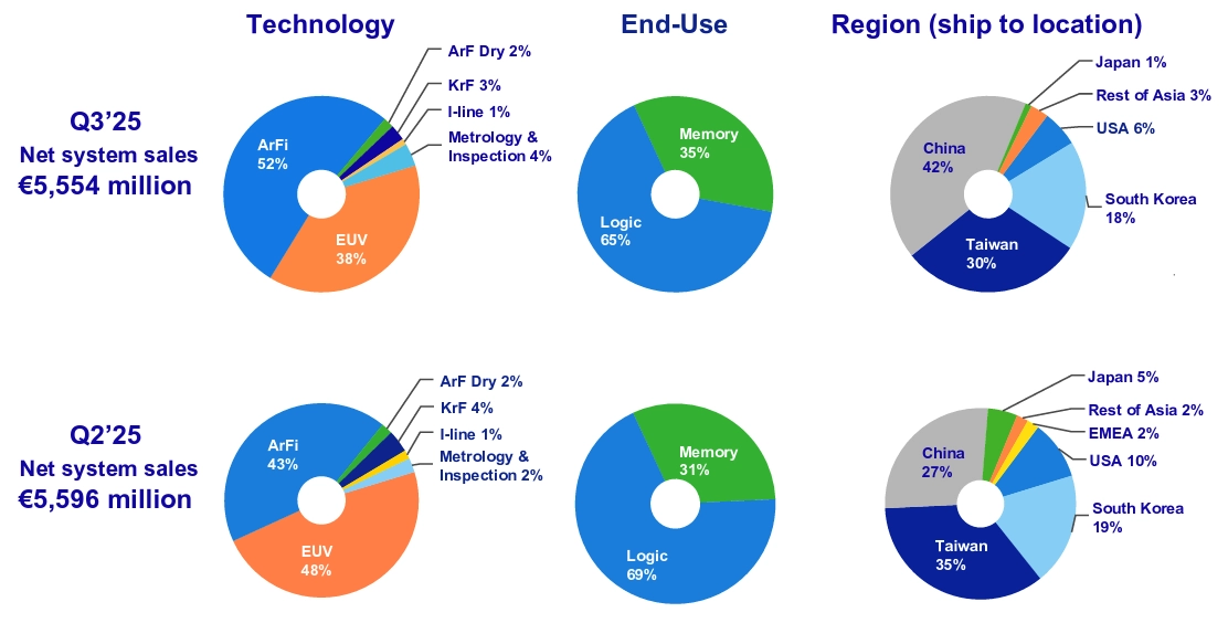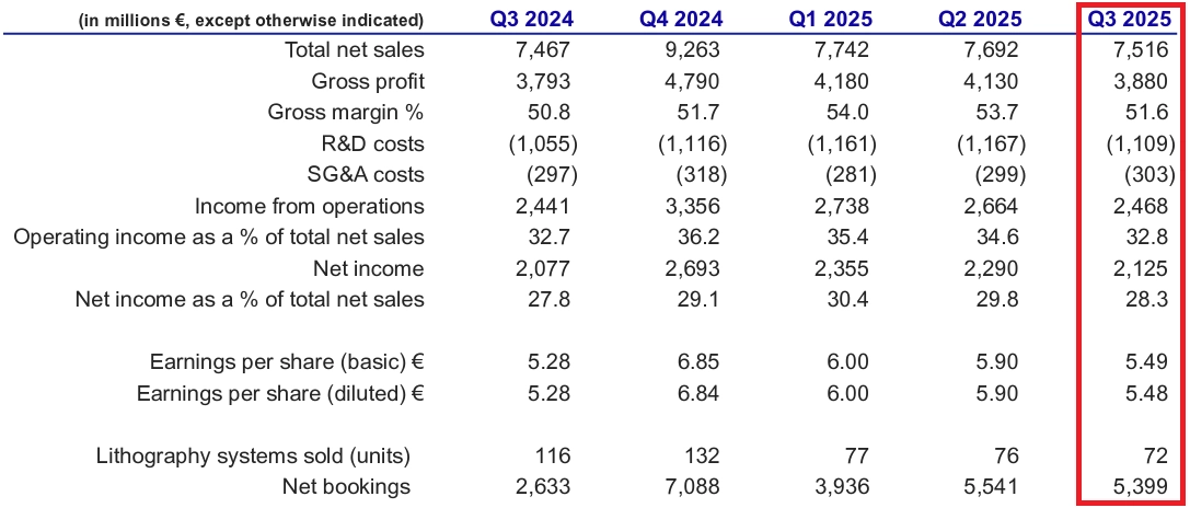 Ve třetím čtvrtletí ASML dosáhla čistých tržeb 7,52 miliardy eur a čistého zisku 2,13 miliardy eur. Zisk tak byl vyšší, než čekali analytici (2,11 miliardy), ale výnosy za jejich odhadem (7,79 miliardy) mírně zaostaly. Před rokem ASML dosáhla kvartálních výnosů 7,69 miliardy eur a zisku 2,29 miliardy. Hodnota objednávek v letošním třetím čtvrtletí dosáhla 5,4 miliardy eur, zatímco analytici vyhlíželi kontrakty za 4,9 miliardy.