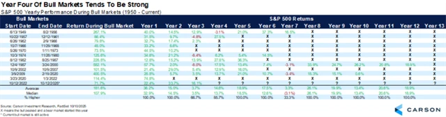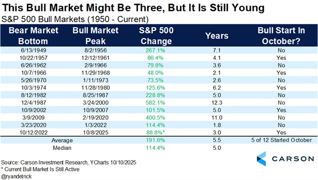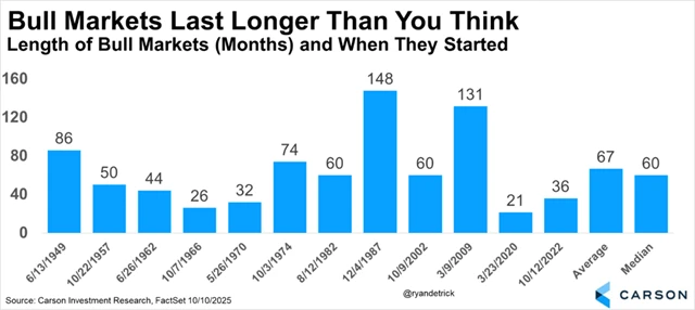 Co už je z logiky věci o něco relevantnější? Když už býčí trh vydrží tři roky, často pokračuje ještě několik dalších let. Z pěti případů za posledních padesát let trval nejkratší takový akciový růst pět let a dva vydržely více než deset let. O současnosti a hlavně budoucnosti to samozřejmě nic moc nenapoví, ale statistika minimálně psychologicky rovnou "nezabíjí" naději na další růst.