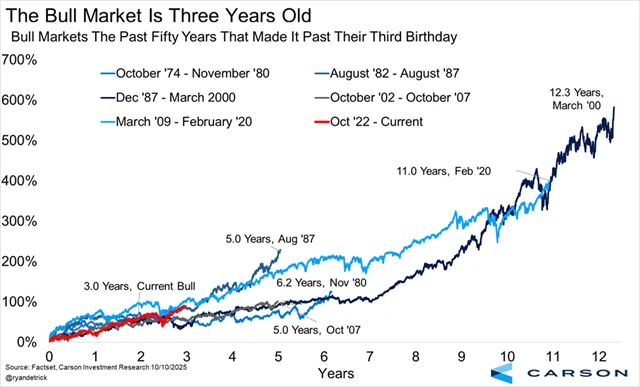 Býčí trend na americkém akciovém trhu (počítaný ode dna v říjnu 2022) trvá už tři roky. Růst tehdy začal po třech kvartálech oslabování trhu, v prostředí zvýšené inflace a rostoucích sazeb Fedu. Před koncem roku 2022 byl ale představen jazykový model ChatGPT a rally na akciovém trhu nabrala na obrátkách. Kam uplynulé tři roky trh posunuly a jak drahé jsou teď americké akcie?