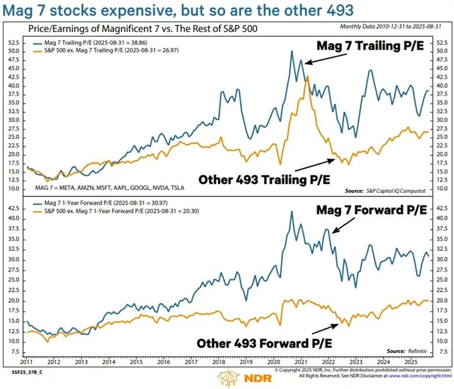 I po očištění o vliv sedmi technologických gigantů (úžasné sedmičky, která má v průměru P/E okolo 39) jsou valuace vysoké. Podle analytiků z Bank of America by ale měli investoři chápat současné hodnoty indikátorů tak trochu jako "nový normál". Neznamená to samozřejmě, že ceny akcií nemohou třeba i výrazně klesnout, ale vzhledem ke změně struktury ekonomiky i složení samotného indexu S&P 500 je logické, že jsou ocenění vyšší. Investoři vyhlížejí další inovace a rozvoj technologiemi poháněného hospodářství.