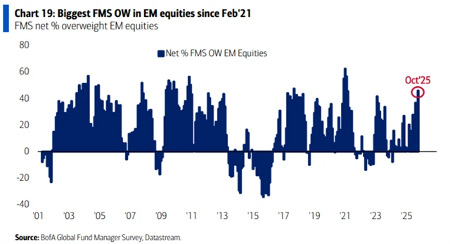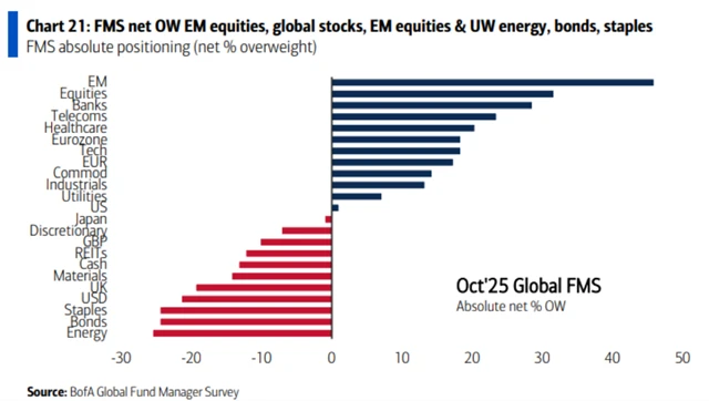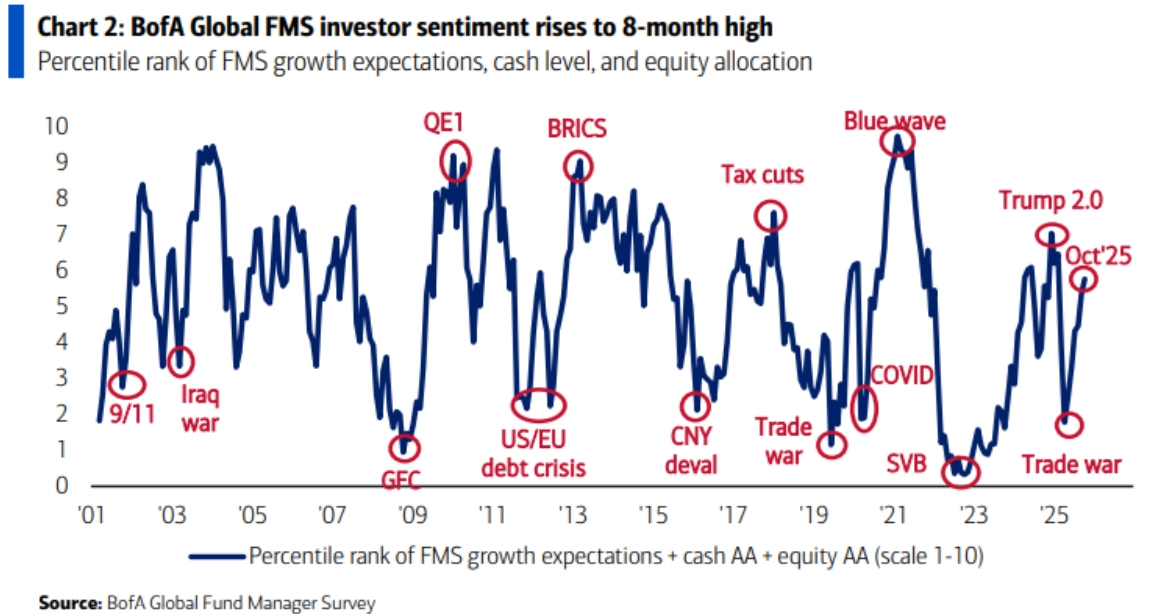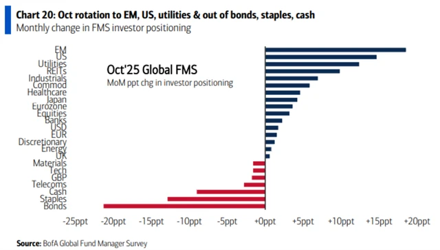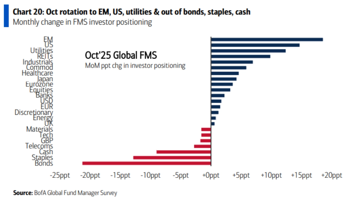 Podle říjnového kola průzkumu Bank of America mezi manažery velkých podílových fondů panuje na trzích výrazný RISK-ON sentiment. Sázky na akcie jsou na osmiměsíčním maximu a podíl hotovosti v portfoliích dále klesl. Zároveň je ale obrovský zájem o zlato. Celé to má ale trochu háček, protože říjnové dotazování probíhalo do 9. října a až o den později Donald Trump pohrozil dodatečným 100% clem na dovozy z Číny.