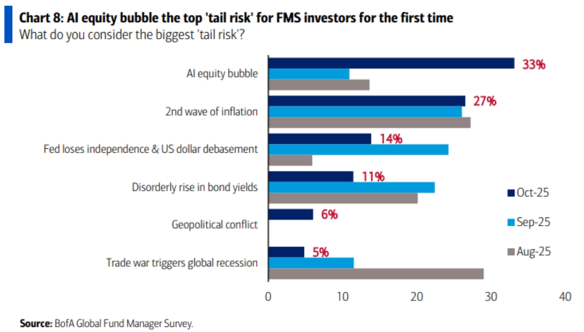 Největšími riziky jsou podle manažerů fondů právě AI bublina, nová vlna inflace a ztráta nezávislosti Fedu a oslabení dolaru.