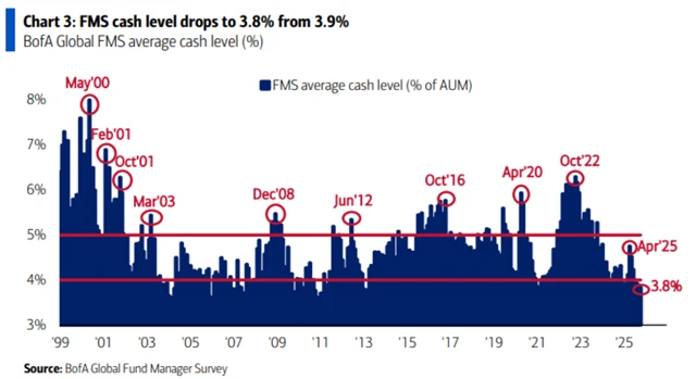 Podíl hotovosti ve fondech klesl na 3,8 %. Podle Bank of America tak pokračuje a zesiluje prodejní signál pro akcie a riziková aktiva obecně.