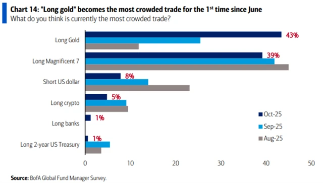 LONG sázka na žlutý kov je podle průzkumu zároveň i "nejpřecpanějším" obchodem. Druhá je LONG sázka na akcie firem z úžasné sedmičky a třetí spekulace na oslabování amerického dolaru.