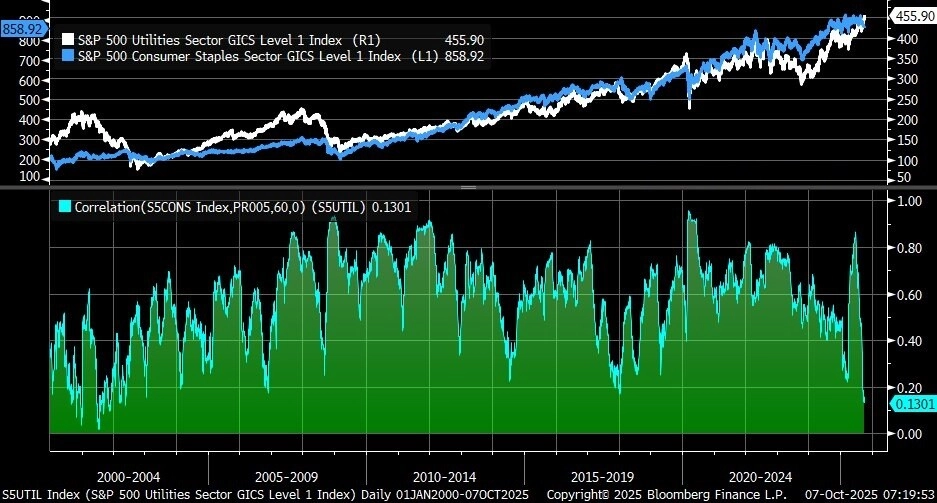 Sázka na akciovou defenzivu jako celek vypadá jinak než v minulosti. Korelace mezi sektory síťových společností (utilities) a základní spotřeby (consumer staples) za posledních 60 dní klesla minulý týden na +0,13 (nejnižší hodnota od roku 2002). V té době utility od začátku roku přidávaly 18,4 %, consumer staples jen 0,6 %. Akciové sektory, které se v minulosti vyvíjely téměř ve shodě, se teď hodně liší. Investoři preferují energetické služby (AI potřebuje hodně energie), běžné spotřební zboží ani zdaleka tolik "nefrčí".