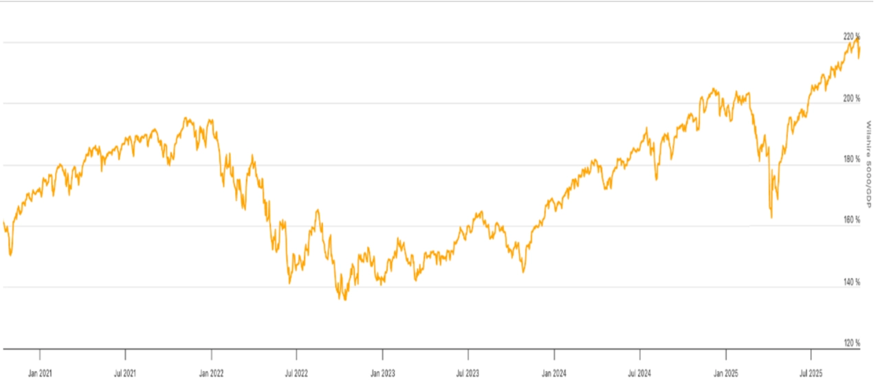 Americký akciový trh zaznamenal jeden z nejsilnějších šestiměsíčních růstů v historii, což má za následek rekordní valuace. Technologické společnosti už tvoří přes 40 % tržní kapitalizace indexu S&P 500 a takzvaný Buffettův indikátor naznačuje, že je americký trh jako celek prakticky nejdražší v historii. Buffettův indikátor je poměr celkové tržní kapitalizace všech akcií k hrubému domácímu produktu dané země. Pokud je výrazně nad 100 %, signalizuje to, že jsou akcie nadhodnocené vůči velikosti ekonomiky, tedy že trh být ve fázi bubliny. Pravděpodobnost prudkých korekcí pak roste.