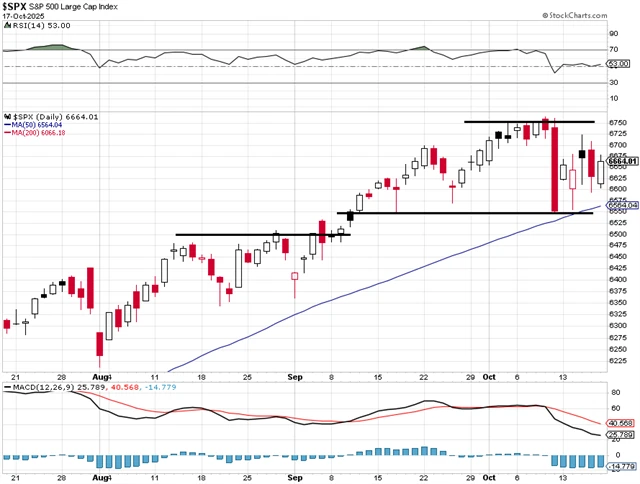 Důležitý support indexu S&P 500 zůstává v pásmu 6 500 až 6 550. Toto pásmo trh otestoval 10. října a také během intradenního poklesu v úterý 14. října. Další support je na únorových maximech v pásmu 6 100 až 6 200. Případné prolomení pod toto rozpětí by pravděpodobně urychlilo další poklesy. Rezistence je v pásmu okolo historických maxim na 6 750.