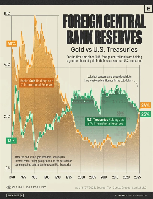 Poprvé od roku 1996 hodnota zlatých rezerv centrálních bank mimo USA převýšila hodnotu jimi držených amerických státních dluhopisů. Tento historický zlom odráží rostoucí odklon od dolarových aktiv směrem k pevným, hmotným aktivům, jako je právě zlato. Důvodem jsou především přetrvávající geopolitická rizika, rostoucí americký dluh a snaha diverzifikovat rezervy mimo americký dolar.