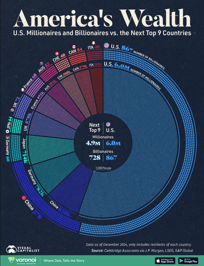 Ve Spojených státech žije přes šest milionů dolarových milionářů. To je skoro 40 % jejich celosvětového počtu. Dolarových miliardářů je tam pak skoro 870, tedy více, než kolik jich dohromady najdete v Číně, Německu a Indii.