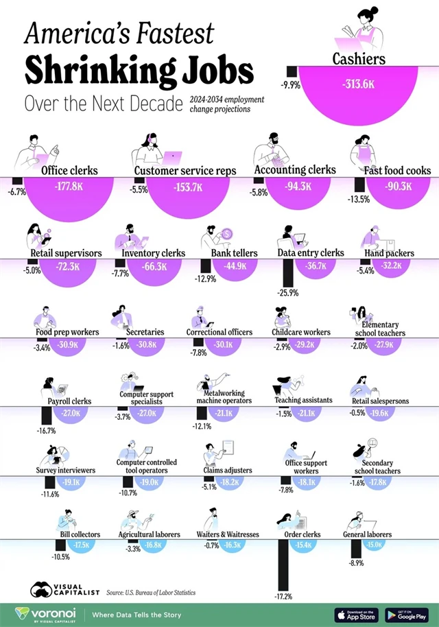 Trh práce prochází proměnou, za níž stojí automatizace, umělá inteligence a digitalizace. Které pracovní pozice jsou nejvíce ohrožené? Takhle to vidí Úřad pro statistiku práce ve své projekci pro Spojené státy hledící do roku 2034.