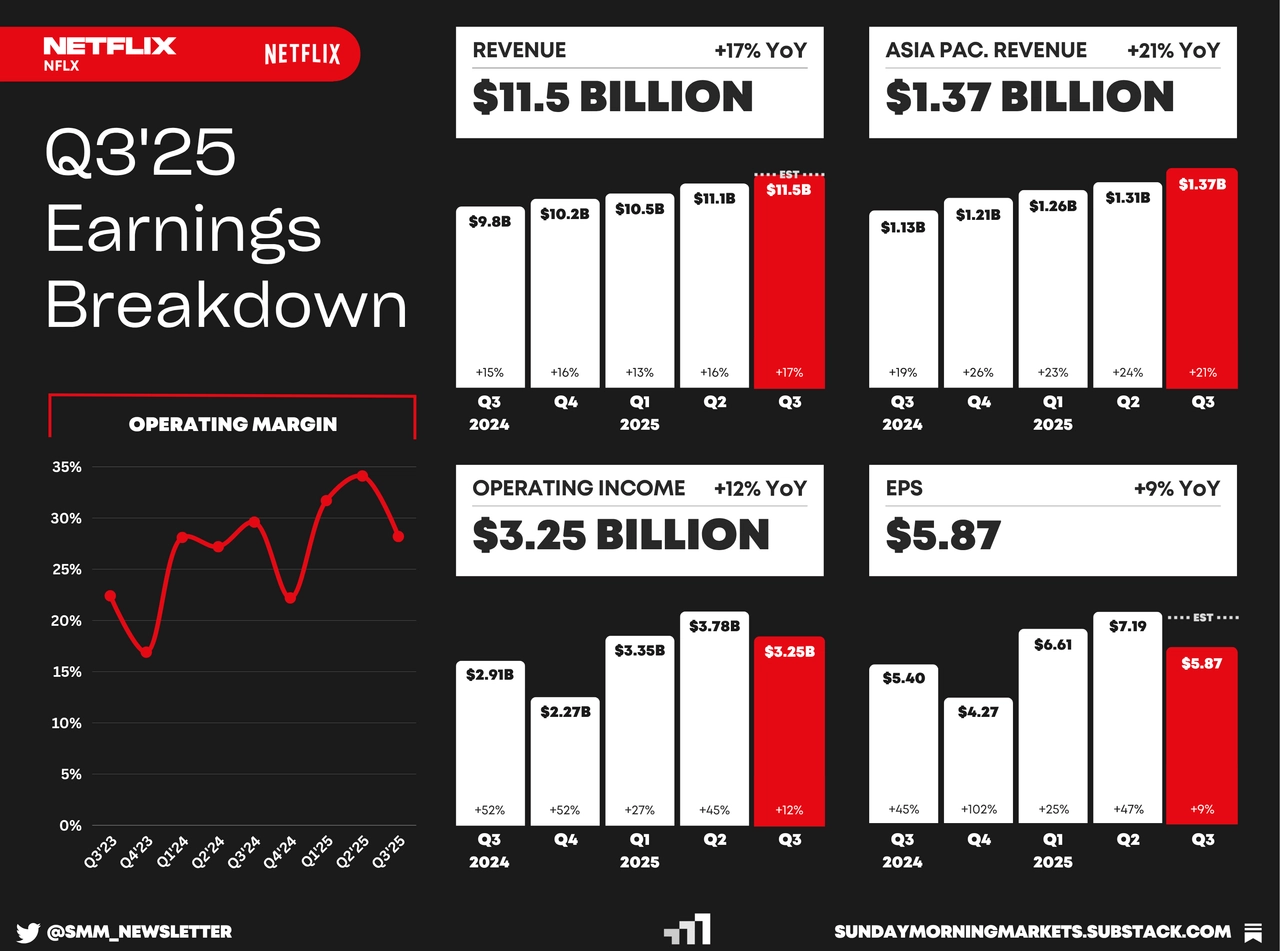 Tržby firmy, která pomáhala předefinovat, s jakým podkresem se na českých i světových gaučích zápasí o medaile za nespavost, prokrastinaci nebo kousání nehtů, stouply meziročně o 17 % na 11,51 miliardy dolarů, přesně podle očekávání analytiků (a vy se jim furt smějete, že jsou vedle; nejsou!), ale zisk na akcii dosáhl jenom 5,87 dolaru namísto vyhlížených 6,97 dolaru. A víte, kdo za to může? Ne analytici, ale berňák. Rovnou ten v Brazílii, se kterým se Netflix handrkuje o nějakých 619 milionů. No, jeho starosti bych chtěl mít. Kvůli sportu v Brazílii provozní marže byla jenom 28 %, firma (si) slibovala 31,5 %.