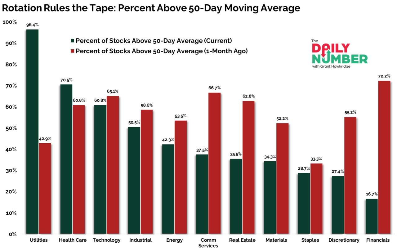 To ale neznamená, že je všechno růžové. Na úrovni sektorů je patrná silná dynamika a rotace peněz směrem k defenzivnějším titulům. Nebo možná lépe řečeno, více teď "trendují" akcie v defenzivních odvětvích zdravotní péče a veřejných služeb. Neznamená to totiž, že třeba finanční nebo spotřebitelské tituly přímo ztrácejí, klesá ale podíl těch, které jsou nad svými 50denními průměry.