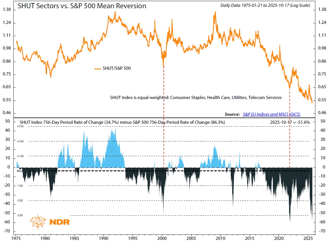 A mimochodem, i když započítáme sektor veřejných služeb, kterému se v posledních týdnech daří nadprůměrně, mají za sebou defenzivní odvětví jako celek ve srovnání s indexem S&P 500 druhé nejhorší tříleté období v historii. Společně se zdravotnictvím veřejné služby zaostaly za celým trhem o 52 procentních bodů, tedy ještě více než v době vrcholící technologické bubliny. Horší výsledek měly už jenom během prudkého oživení po bleskovém medvědím trendu na začátku pandemie.