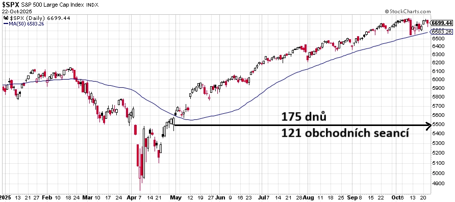 Index S&P 500 uzavírá nad svým 50denním průměrem už 175 kalendářních, respektive 121 obchodních dnů. Je to osmá nejdelší taková série v historii a vůbec nejdelší od roku 2011. Býci ustáli i výrazný pokles z pátku 10. října a trh se znovu posunul do blízkosti historických maxim.