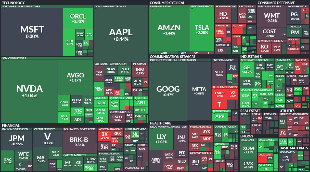 Index Dow zpevnil o 0,31 % na 46 734,61 bodu, širší S&P 500 přidal 0,58 % na 6 738,44 bodu a index technologického trhu Nasdaq Composite si připsal 0,89 % a den zakončil na 22 941,80 bodu. Index volatility VIX spadl o 6,99 % na 17,30 bodu a výnos 10letých vládních dluhopisů USA se zvýšil o pět bazických bodů na 4,005 %.