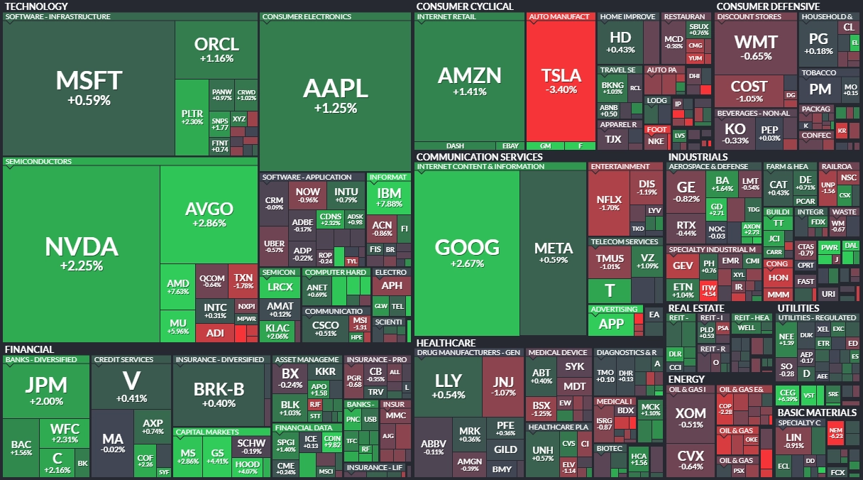 Index Dow přidal 1,01 % na 47 207,12 bodu, širší S&P 500 se zvýšil o 0,79 % na 6 791,69 bodu a index technologického trhu Nasdaq Composite zpevnil o 1,15 % na 23 204,87 bodu.
