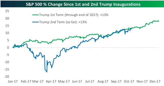 Začátek Trumpova druhého prezidentského období investory (hlavně v souvislosti s divokou celní politikou) vyděsil. Teď už je ale, zdá se, všechno zapomenuto. Index S&P 500 od Trumpovy inaugurace přidává 13 % a výkonnostně dohnal to, jak se mu dařilo během prvního roku prvního Trumpova funkčního období.