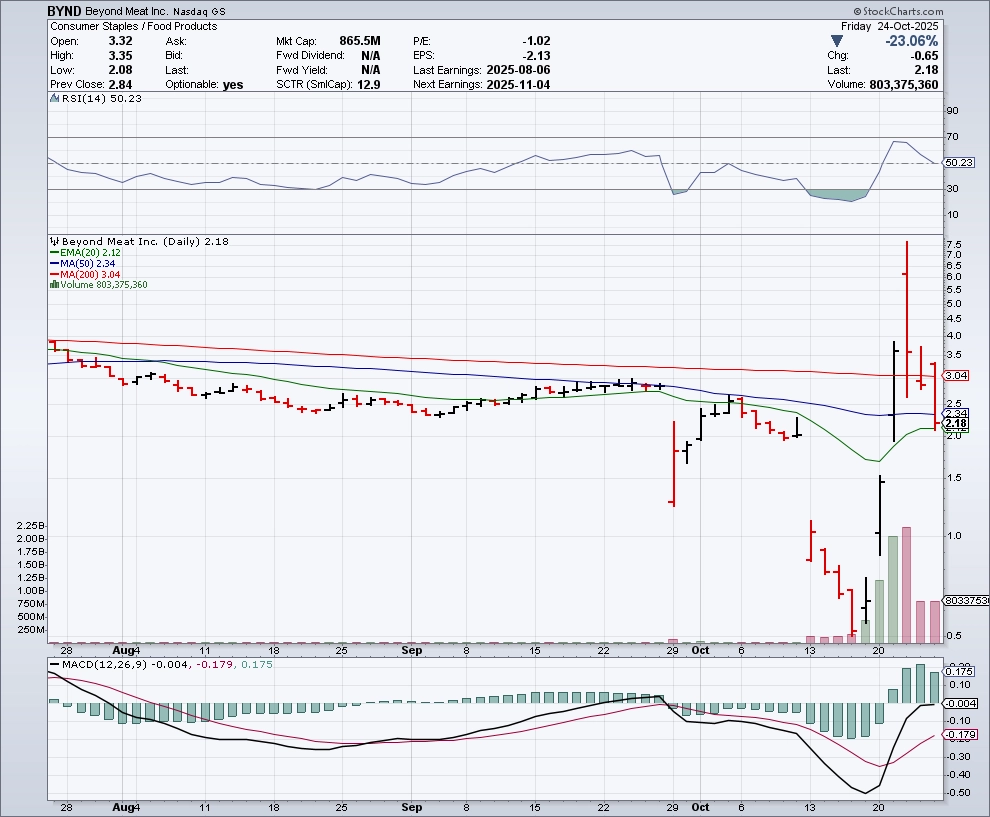 Před pěti lety byla společnost Beyond Meat vlajkovou lodí potravinové revoluce. Rostlinné maso mělo změnit svět, akcie firmy po vstupu na burzu v roce 2019 zdražily na více než 235 dolarů a investoři věřili, že se dívají na nového lídra globálního potravinářství. Na podzim 2025 ale sledujeme úplně jiný příběh. Vidíme firmu, jejíž hodnota se smrskla skoro na nulu a stala se symbolem nenaplněných očekávání. V říjnu se titul s meme větrem v zádech vyslal z burzovního mikrokosmu nečekanou zprávu v podobě růstu o stovky procent. Chytá snad Beyond Meat druhý dech?