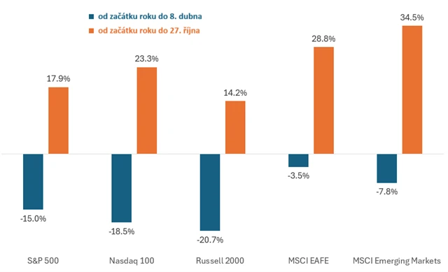 Ode dna se odrazily i další trhy, třeba celoevropský index STOXX Europe 600 se od 9. dubna vyhoupl nahoru o 22 % a třeba emerging markets jako celek za stejnou dobu přidaly dokonce přes 40 %. Trhy jsou prostě mistři dramatických obratů. V dubnu se řešily celní války a hrozba rozpadu světového řádu, v říjnu jako kdyby už naopak nemohlo akciovou rally nic zarazit. Něco se najde, to je jasné, jen se na to zatím čeká.