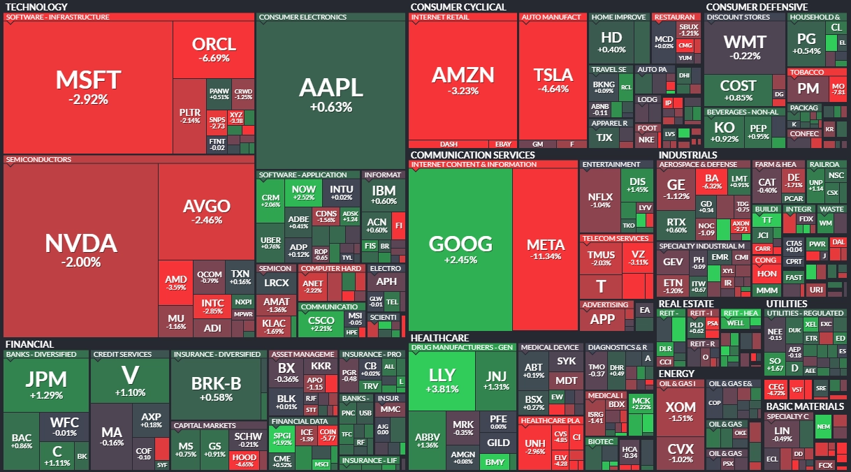 Index Dow klesl o 0,23 % na 47 522,12 bodu, širší S&P 500 odepsal 0,99 % na 6 822,34 bodu a index technologického trhu Nasdaq Composite přišel o 1,57 % a den zakončil na 23 581,14 bodu. Index volatility VIX se snížil o 0,06 % na 16,91 bodu a výnos 10letých vládních dluhopisů USA stoupl o zhruba půl bazického bodu na 4,097 %.