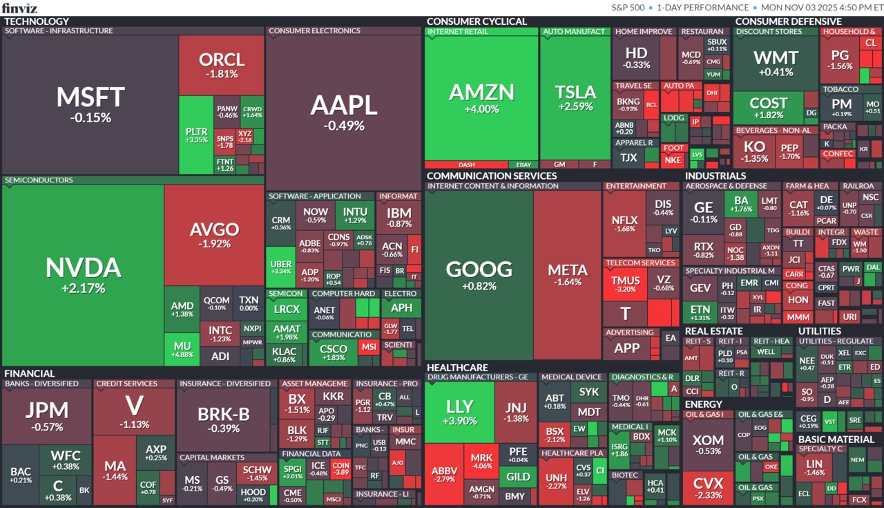 K pozitivní náladě výrazně přispěl Amazon (+4,00 %) po oznámení dohody se společností OpenAI v hodnotě 38 miliard dolarů. V rámci partnerství budou využívat mimo jiné statisíce grafických procesorů od Nvidie (+2,17 %). Ta vedle toho oznámila, že získala licenci pro export čipů do Spojených arabských emirátů, kde do roku 2029 zde plánuje investovat přes 15 miliard dolarů.