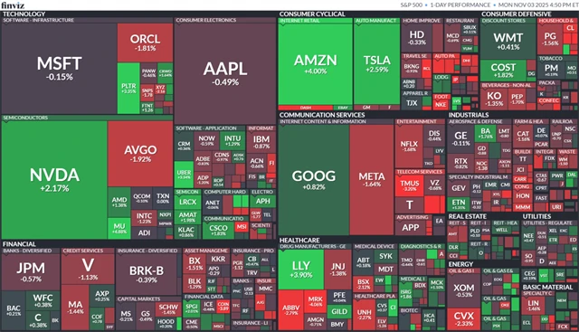 Mimo technologický sektor se ale trhu příliš nedařilo. Přes 300 akcií z indexu S&P 500 uzavřelo v minusu. Analytici upozorňují, že malý podíl posilujících titulů může být časem problém. Podle Gila Lurii z firmy D.A. Davidson jsou hlavními vítězi současného trendu firmy jako NVIDIA, Microsoft, Alphabet (+0,82 %), Amazon a Palantir (+3,35 %, po skončení obchodování firma oznámila hospodářské výsledky), které dokáží zajistit potřebnou infrastrukturu a těží z rostoucí poptávky po výpočetním výkonu pro AI. Tyto společnosti mají dostatek kapitálu k dalšímu rozšiřování kapacit i k pronájmu výkonu od externích poskytovatelů.