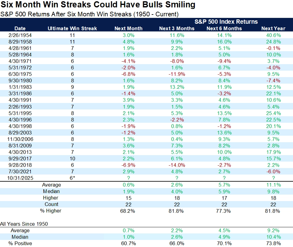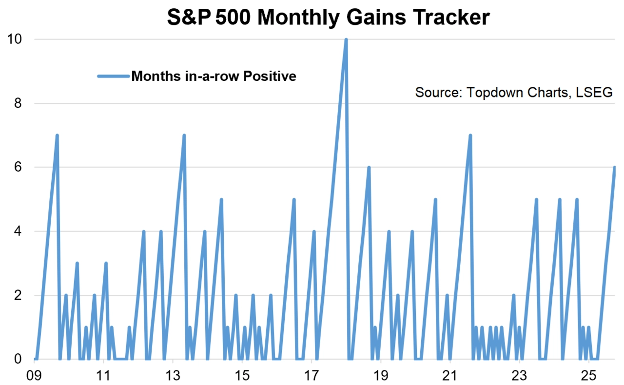 Má za sebou šest měsíčních růstů. Po takových a delších sériích má S&P 500 silnou tendenci pokračovat v růstu.
