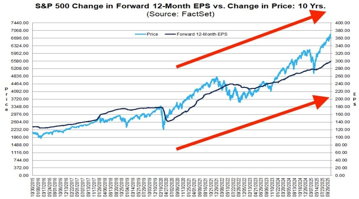 V téhle souvislosti je celkem dobré upozornit na to, že před zhruba pěti lety, po prudkém tržním oživení po ještě strmějším a bleskovém medvědím trendu, se forwardové P/E indexu S&P 500 vyhouplo ještě výše (23,6). A tím se dostáváme k jednomu ze zásadních momentů současného hodnocení kondice amerického trhu. Před pěti lety se totiž index S&P 500 pohyboval okolo 3 500 bodů, zatímco v uplynulém týdnu testoval hladinu 6 900 bodů. Jinými slovy, ceny akcií se za pět let skoro zdvojnásobily, ale zisky firem také.