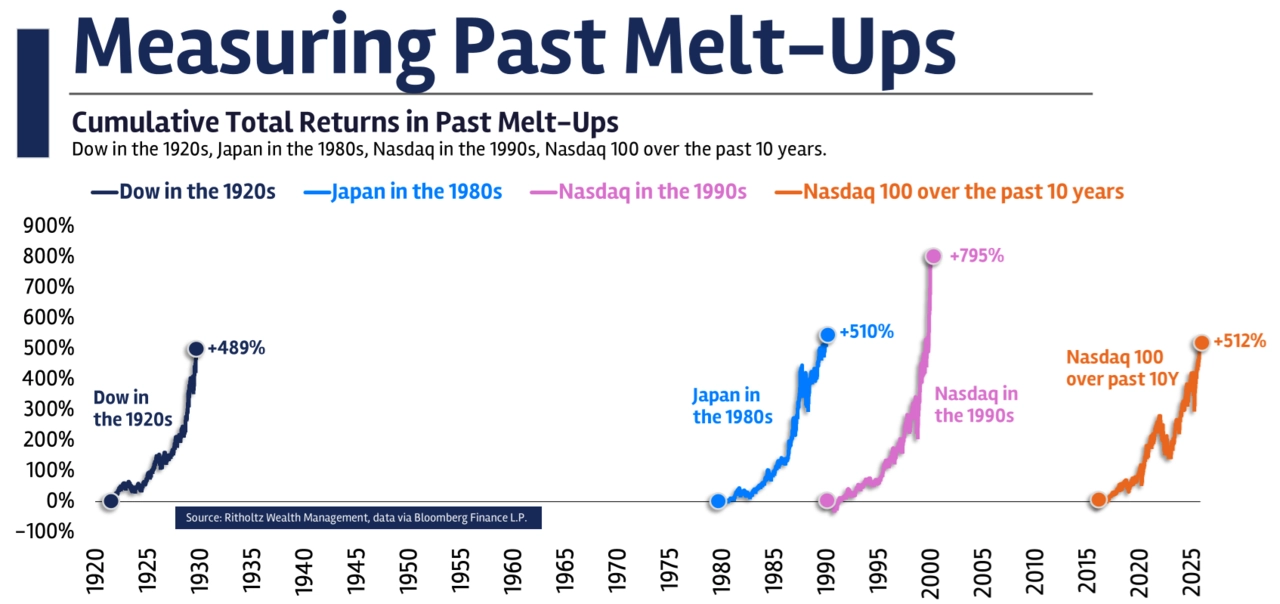 "Čísla jsou opravdu už podobná těm z 20. let 20. století na Wall Street, z Japonska 80. let nebo z doby vrcholící technologické bubliny před rokem 2000. Současné technologické giganty jsou ale nesrovnatelně silnější než třeba ona vlna internetových startupů z 90. let, které mnohdy neměly žádný reálný byznys. Dnes táhnou trh nahoru největší firmy světa, které mají obrovské zisky a masivně investují, aby mohly své pozice minimálně udržovat," říká Ben Carlson ze společnosti Ritholtz Wealth Management. "Bylo by ale hodně troufalé očekávat, že index Nasdaq-100 dále poroste o 20 % za rok. Taková dynamika není dlouhodobě udržitelná. Neznamená to ale zároveň, že musí přijít hluboký propad trhu."