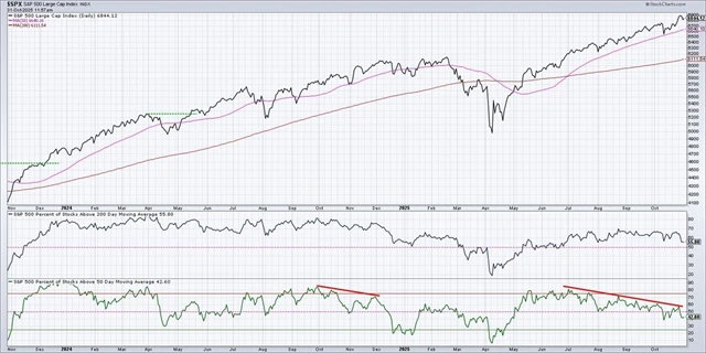 Je pravda, že v posledních několika měsících postupně ubývá titulů nad 200denním a hlavně nad 50denním klouzavým průměrem. Růst indexu S&P 500 tak táhne postupně stále menší skupina firem.