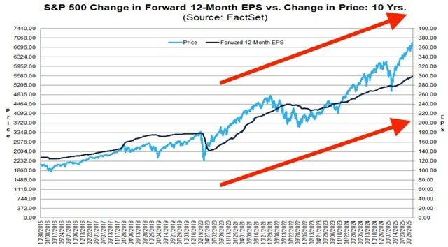 To samozřejmě neznamená, že akciový trh poroste donekonečna bez výraznějších poklesů. Nicméně P/E v tomto směru nejde chápat jako vodítko, protože ukazatel může klesnout jak kvůli korekci cen akcií, tak díky růstu zisků. A pokud budou se budou firemní výsledky dále zlepšovat, valuace se mohou "znormalizovat" i bez kolapsu akciového trhu. Analytici přitom čekají dvouciferný růst zisků v rámci indexu S&P 500 minimálně do roku 2027.