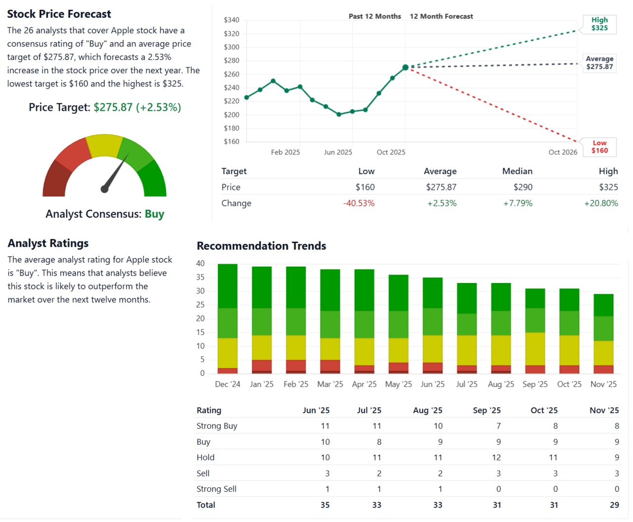 Průměrná cílová cena podle 29 analytiků sledovaných společnosti Stock Analysis je jen zhruba 275 dolarů.