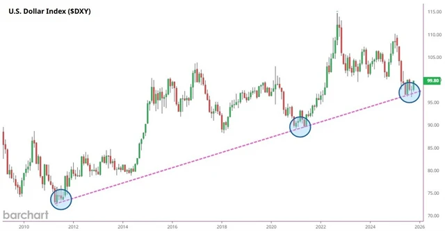 Technická analýza je složitá disciplína, ale také poměrně volná umělecká tvorba. Ti, kdo z jakýchkoli důvodů věří nebo chtějí věřit v sílu amerického dolaru, mohou nakreslit (prozatím potvrzenou) linii podpory takto. Technická analýza v mnohaletém horizontu je ale opravdu jen popis hlavních trendů, ne hledání signálů pro další významný pohyb.